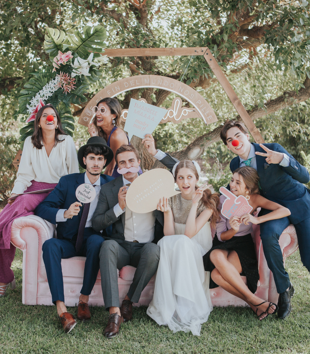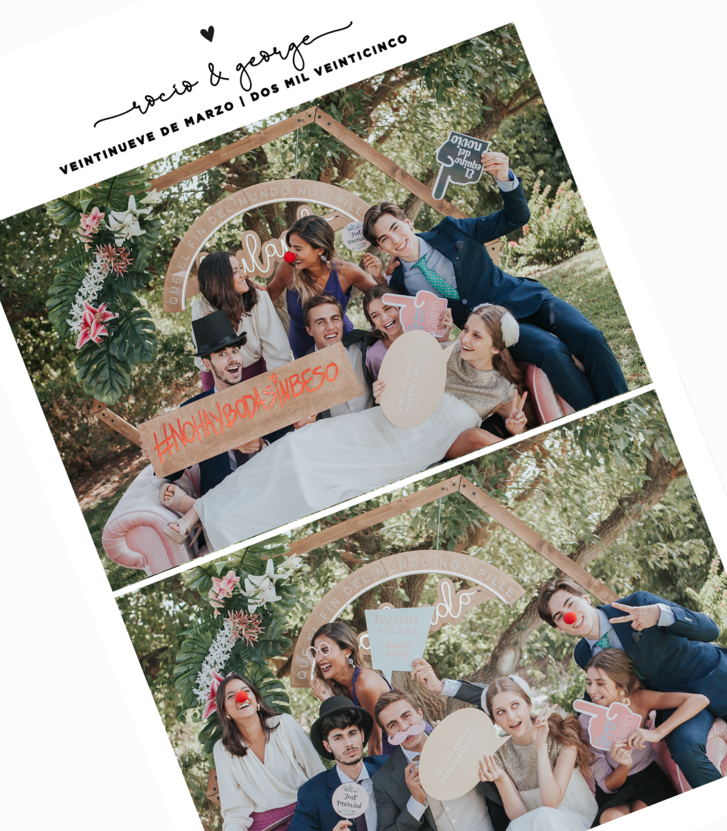 Desde el primer momento, el rincón se convierte en un imán para los invitados. Cogen el atrezzo, posan y se llevan sus fotos impresas al instante. De cada foto pegamos una copia en el álbum y animamos a los invitados a dejar un mensaje.